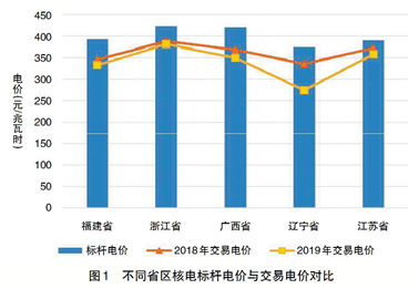 2018年,福建、浙江、廣西、遼寧、江蘇五省的核電機組參與了市場交易,五省的平均交易電價分別為345.8元/兆瓦時、389.0元/兆瓦時、368.6元/兆瓦時、335.6元/兆瓦時和372.9元/兆瓦時。2019年1季度,福建、廣西、江蘇、遼寧和浙江平均交易電價分別為332.9元/兆瓦時、349.9元/兆瓦時、358.3元/兆瓦時、274.3元/兆瓦時和382.1元/兆瓦時。交易電價持續(xù)下降,遼寧交易電價比標(biāo)桿電價下降100元/兆瓦時以上。具體交易情況如表1和圖1所示,各省平均交易電價均較標(biāo)桿電價有不同程度的下降,且交易電價呈持續(xù)下降趨勢。